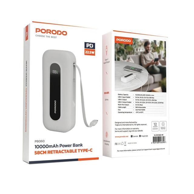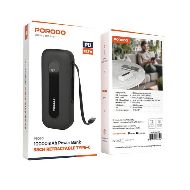 Porodo PD-PBFCH060 10,000mAh Power Bank with Retractable Type-C Cable
