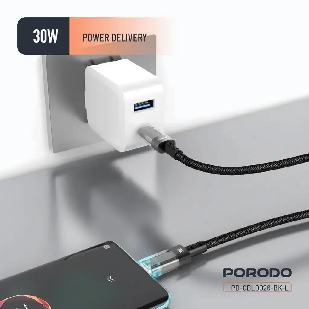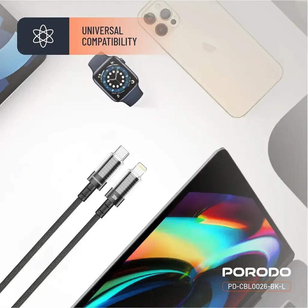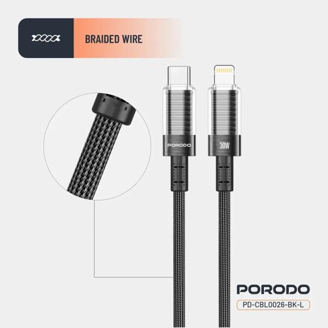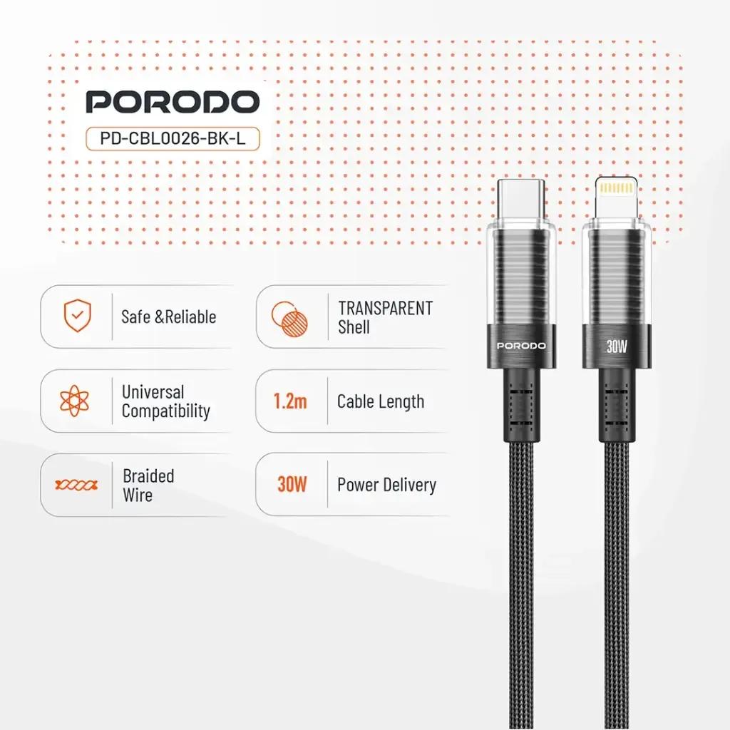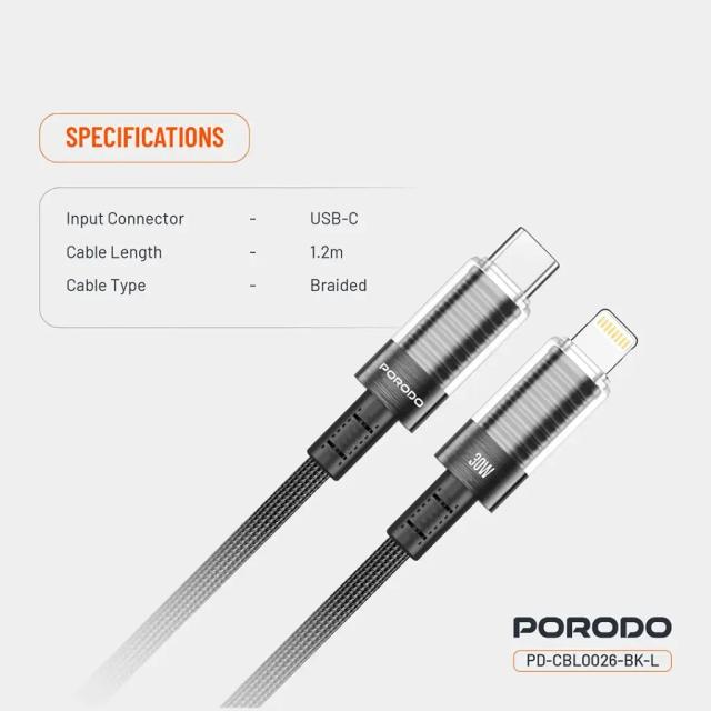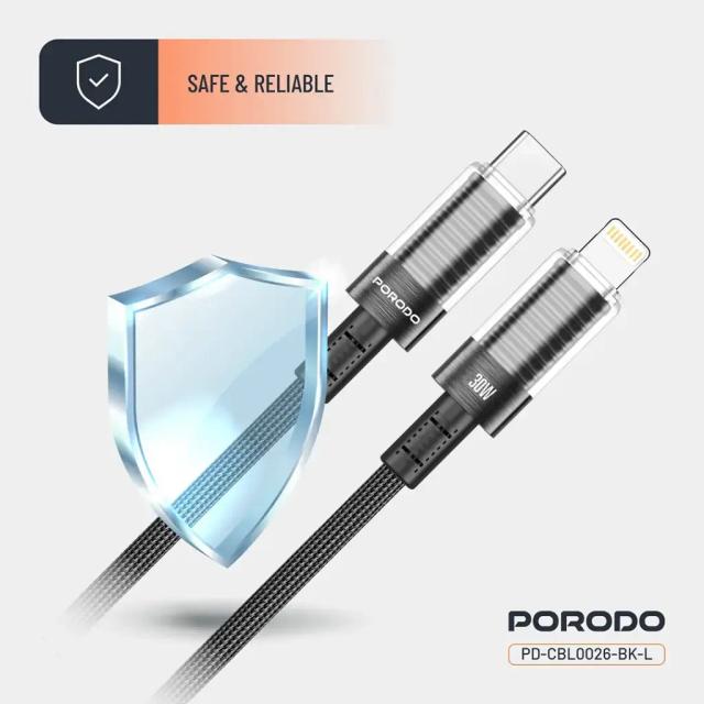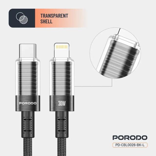 Porodo PD-CBL0026-BK-L Transparent Shell USB-C to Lightning Cable