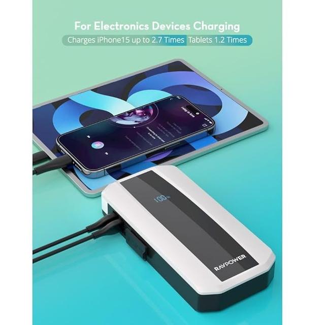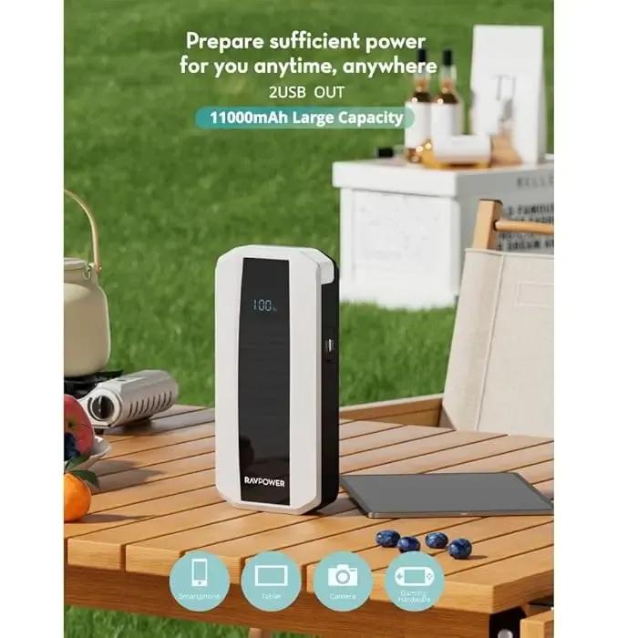 - Not just for your car—charge your phone and devices too! It’s equipped with an 11000mAh battery and includes:
