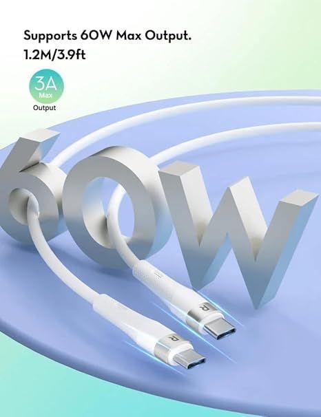 If you're looking for a cable that charges quickly, lasts for years, and doesn't fray or break, the RAVPower Silicone Type-C Cable in White is your companion, relieving you of the daily worry of charging. With 60W of power, it delivers fast charging and works wherever you are.