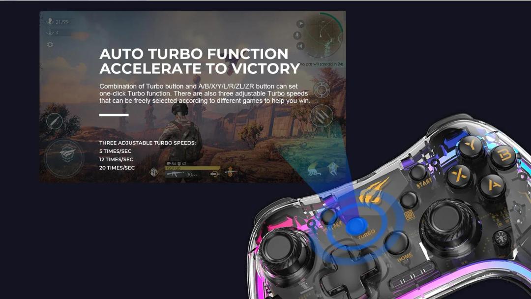 In fast-paced games, the turbo button auto-fires with 3 adjustable speeds – no more wasting time on repetitive tapping.