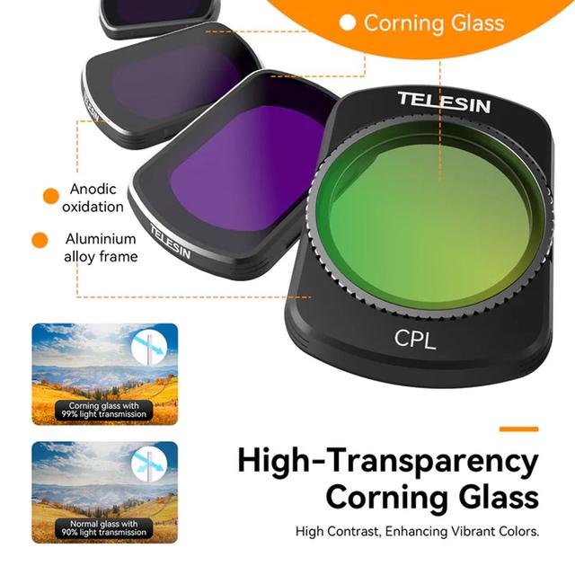 With the TELESIN CPL + ND16/64/256 Filter Set for DJI Pocket 3, you can easily control light and reflections, ensuring every shot looks clean, vibrant, and perfectly exposed—without glare or overexposure.