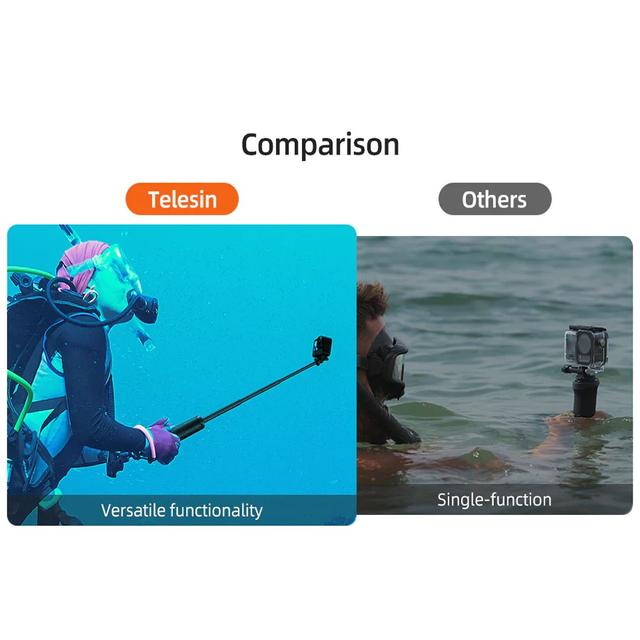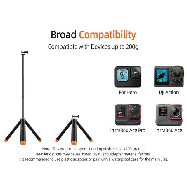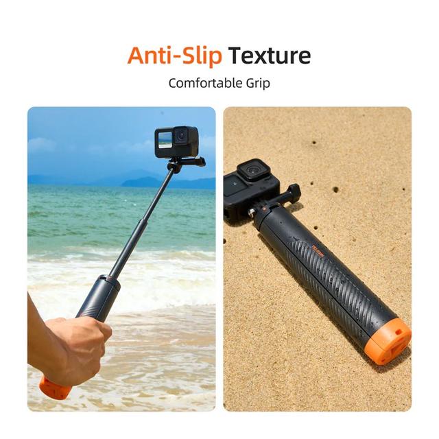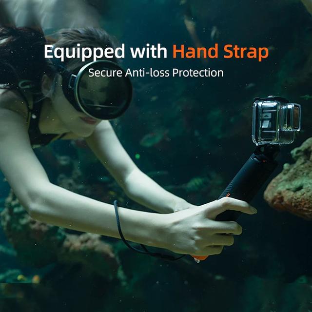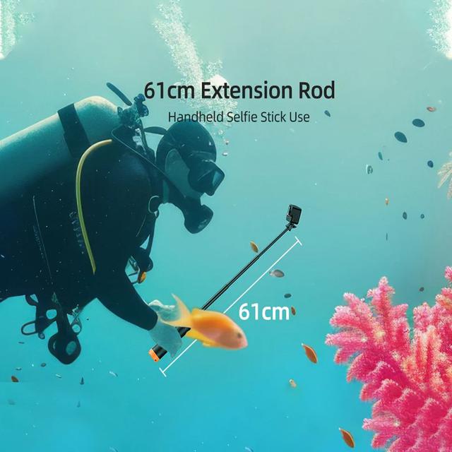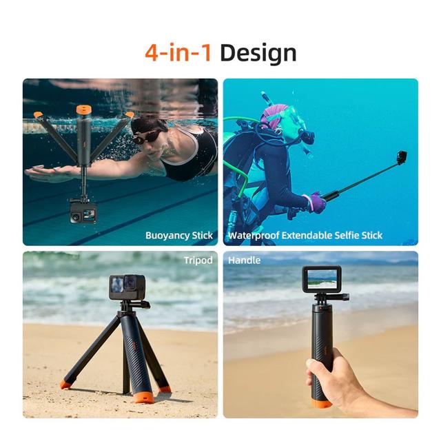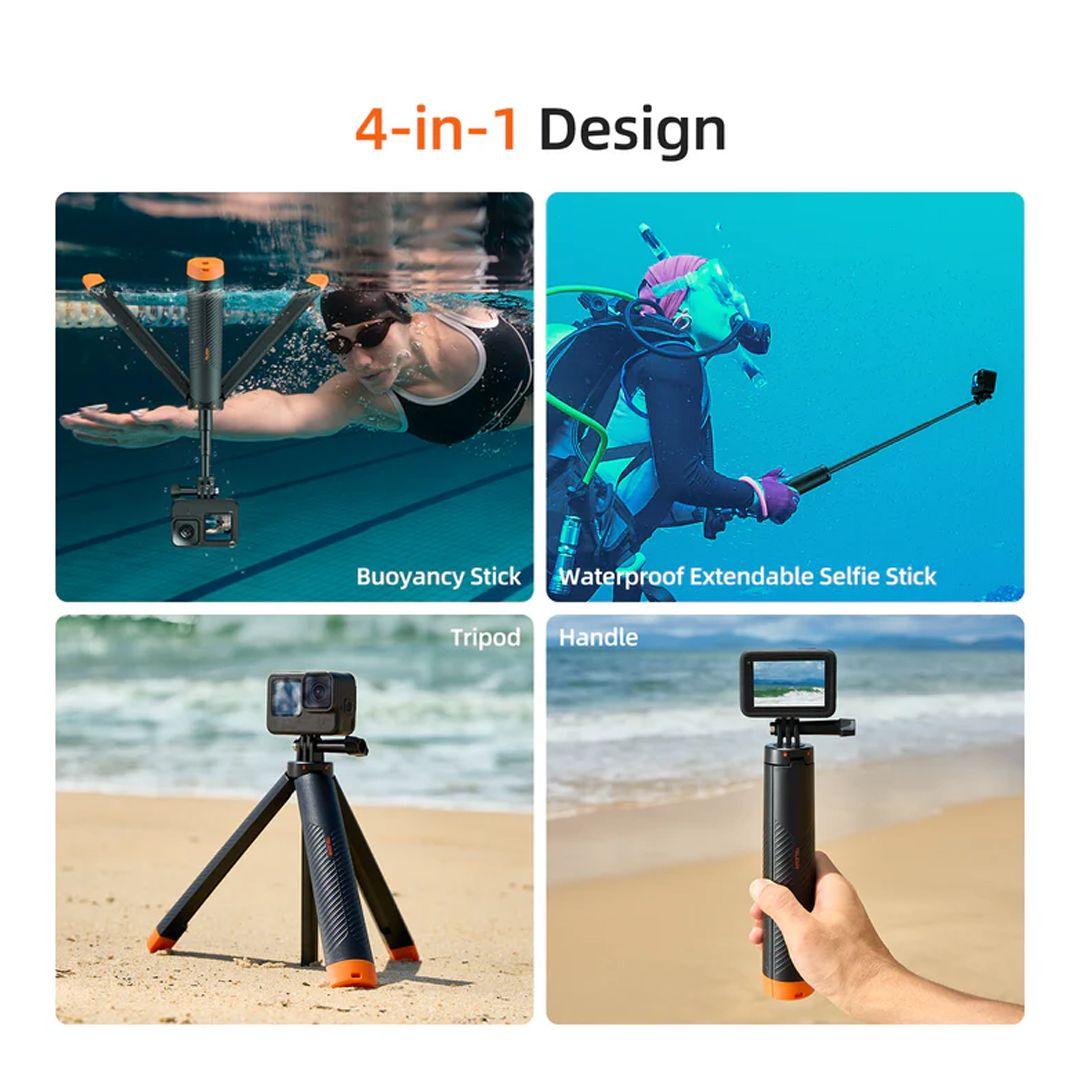 Not just a selfie stick! This multifunctional accessory combines four tools in one: a buoyancy stick to keep your camera afloat, an extendable selfie stick for wide-angle shots, a tripod for stable hands-free filming, and a comfortable handle for daily use. One product replaces four separate accessories.
