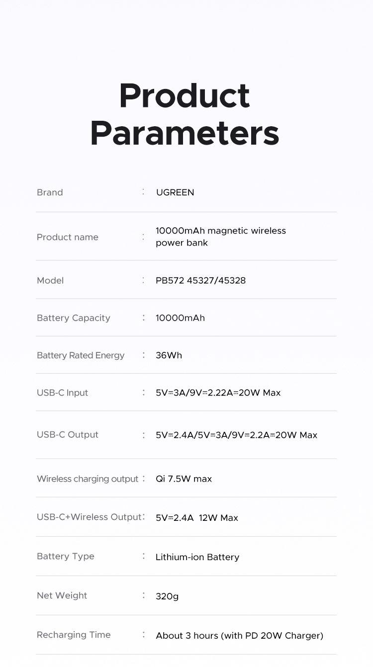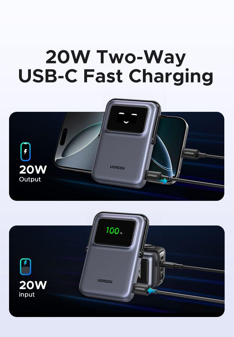 Wireless and Wired Charging: Ugreen battery bank offers 7.5W magnetic charging, while also supporting PD 20W wired charging. It combines convenience and power to ensure you can power two devices at the same time