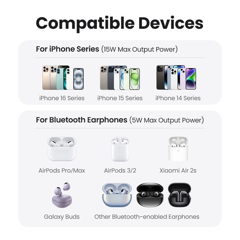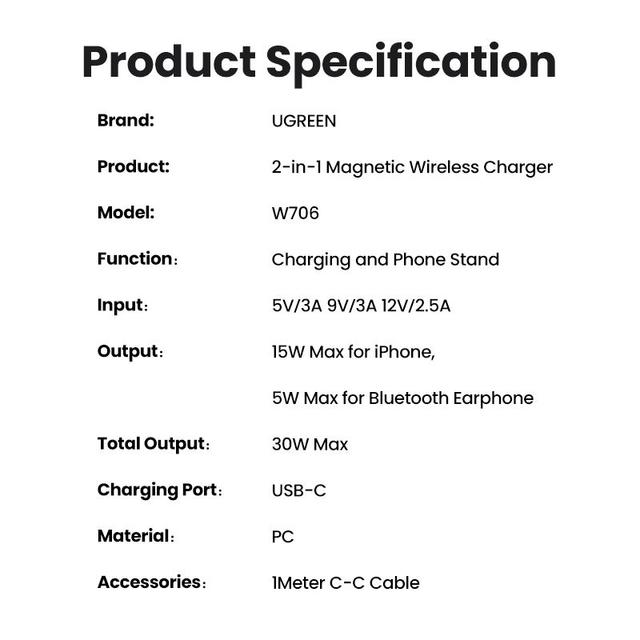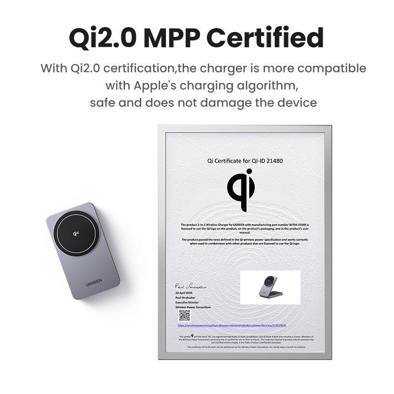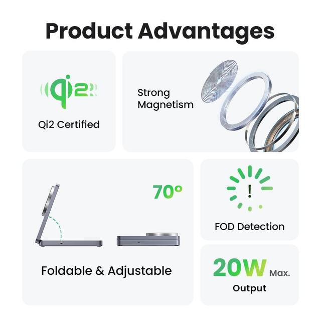 (2 in 1 unit *Wireless Charging) The UGREEN MagFlow wireless charger allows you to charge 2 iPhone and AirPods simultaneously at the same time. MagSafe compatible charger, charging speed as original Apple charger No need for messy charging cables, just place it on and charge it. The charging stand has 2 built-in coils, so it can be charged either vertically or horizontally, and can be charged while watching videos. Useful for everyday life and business