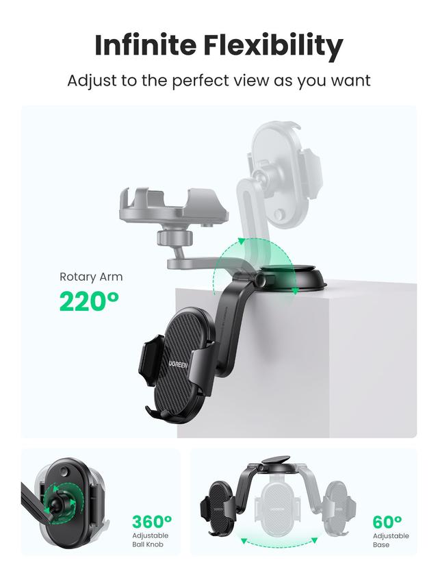 -This UGREEN Suction Cup Car Mobile holder features a 360-degree rotatable ball, you can adjust your phone to a perfect viewing angle. The rotary long arm can be pivoted up to 220 degrees freely, which enables you to reach your phone easily.