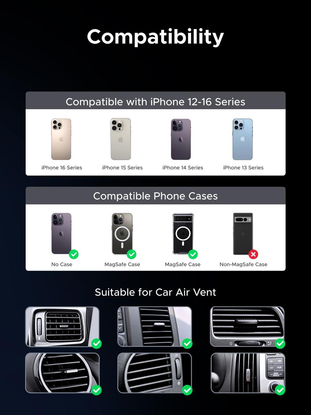 UNIVERSAL FIT FOR MOST VEHICLES - MagSafe Wireless Charger 15W fits perfectly into any type of air outlet, whether horizontal or vertical, and can be easily installed in just three steps. Even on uneven roads, your phone remains safe and stable, so you can fully concentrate on driving.