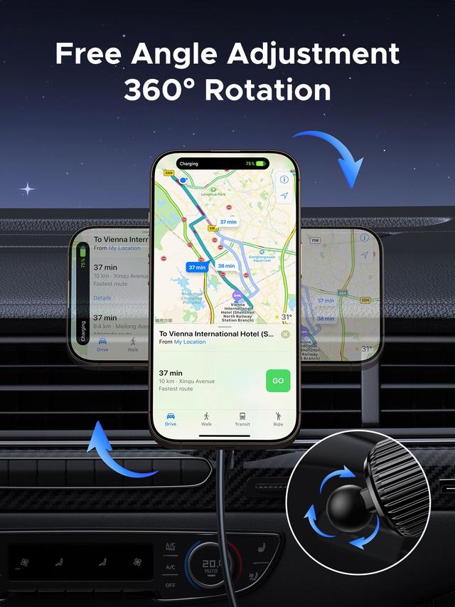 Easy to use and very flexible: Wireless car charger offers you maximum flexibility and convenience and is the perfect companion when traveling. Whether you want to use your phone as a navigation device or just listen to music, with just one hand you can rotate your phone 360 degrees and place it horizontally or vertically as needed.