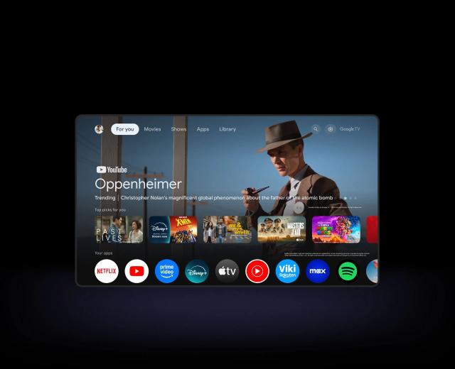 Google TV OS with voice search and curated content recommendations.