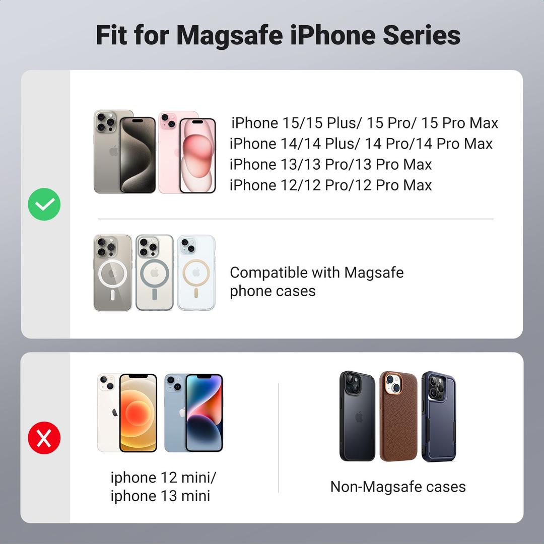 【Compatible with MagSafe】The UGREEN MagSafe wallet case is only compatible with iPhone 12/13/14/15 series phones and MagSafe cases. (Not compatible with iPhone 12 Mini/13 Mini) Phones and cases not compatible with MagSafe can be used with a MagSafe metal ring (not included).
