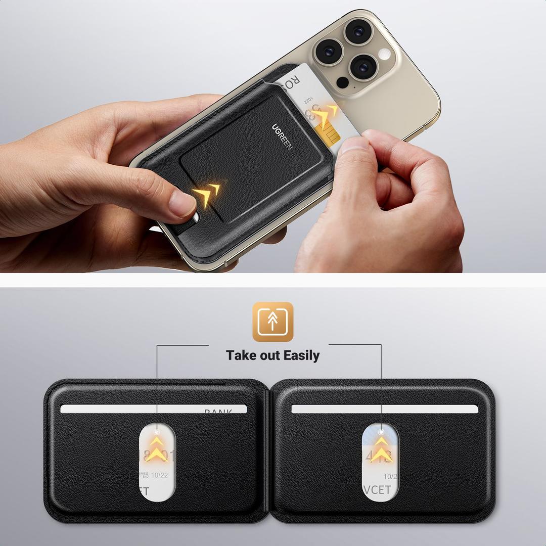 【Strong and Never Falls Off】Using upgraded 1300gf magnets, the UGREEN magnetic wallet is 185% stronger than ordinary magnets in terms of holding power. It provides a strong connection between the wallet and a MagSafe-compatible phone without any accidental drops.