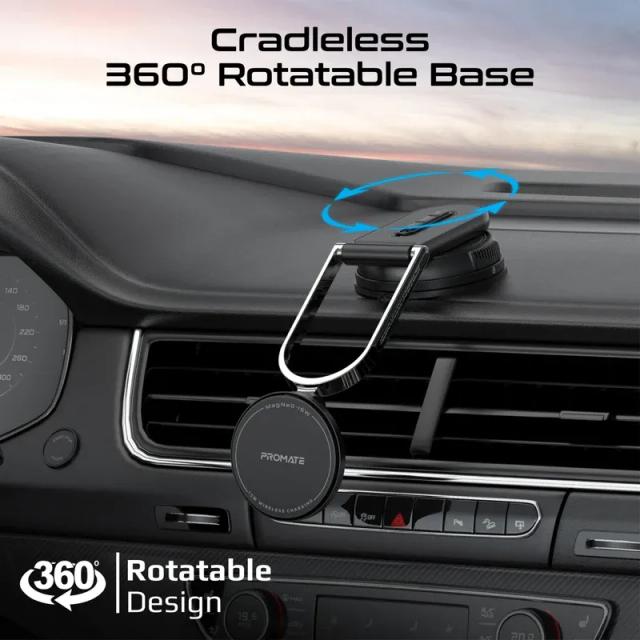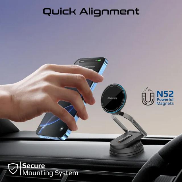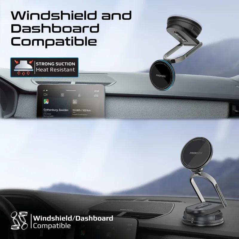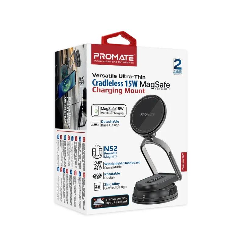 Revolutionize the way you charge on the go with Promate’s MagNeo-15W. This wireless phone charging mount combines sleek design and cutting-edge technology for a seamless experience. Delivering 15W MagSafe-compatible charging, it ensures your devices are always powered up with speed and efficiency. The adjustable extendable arm and detachable body with a secure lock mechanism, offer unmatched versatility, making it perfect for both Windshields and dashboards. Built with durable zinc alloy and a cradleless 360° rotatable base, it provides optimal viewing angles while keeping your device securely in place. Quick alignment and a multi-safety system, including Foreign Object Detection (FOD), ensure effortless and safe charging on the road.