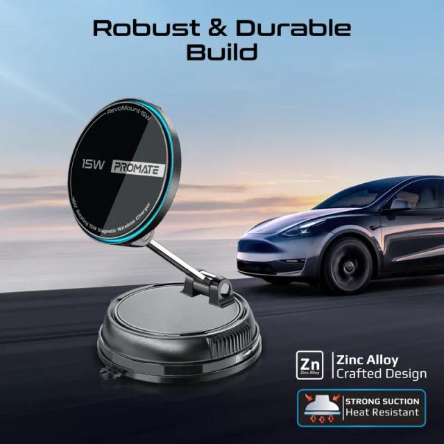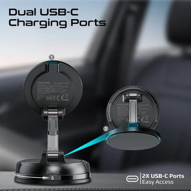 RevoMount-15W redefines on-the-go charging with its SecureGrip™ cradleless magnetic mount and fast 15W wireless charging. Designed for MagSafe-compatible phones and cases, it delivers an unmatched magnetic attraction force of 16N, ensuring a firm and stable hold even on rough roads. The dual-rotating shaft and 360° base provide seamless angle adjustments for perfect viewing from any position. Built with premium ABS, PC, and Zinc Alloy, RevoMount-15W combines rugged durability with elegant design. Featuring a dual USB-C port system, it offers flexible cable management, keeping your dashboard/desk neat. With cutting-edge N52 magnets, clutter-free cable management and flexible positioning, RevoMount-15W delivers fast and reliable charging every drive.