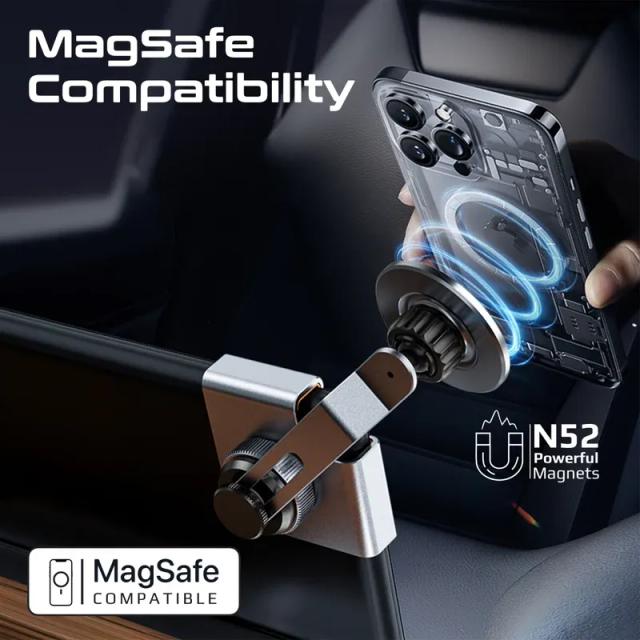 The MagHold-90 by Promate redefines the driving experience with its SecureGrip™ Car Monitor Phone Holder, offering unparalleled stability and ease of use. This premier product to the market features military-grade N52 magnets and MagSafe compatibility, ensuring your phone stays firmly in place on car monitors ranging from 7 to 14.6mm. The 360° rotation adjustment and high telescoping capability allow for seamless angle changes, enhancing visibility without obstructing the monitor. Its cradleless design, combined with silicon-protected brackets for anti-shaking and extra stability, keep both your phone and car monitor secure. Built from durable materials, the MagHold-90 combines innovation and practicality for a safer, more convenient drive. Drive with confidence and clarity, knowing your phone is secure and easily accessible.