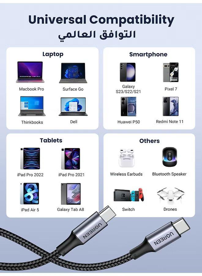 This USB-C to USB-C cable ensures safe charging up to 5A for USB-C-enabled laptops, mobile phones, and tablets. It supports Power Delivery (PD) technology, providing faster charging with a maximum output of 20V and 5A.