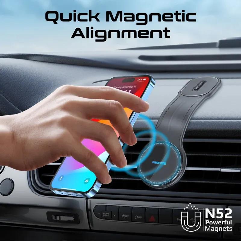 LaxMount-15W, a MagSafe-compatible wireless charging car mount, delivers lightning-fast 15W charging speeds while ensuring quick and secure magnetic alignment. Its sleek and slim design seamlessly complements your smartphone and car interior, providing a space-efficient solution. The safety chip guarantees secure charging with protection against overcurrent, overheating, over-voltage, and short-circuit issues. With a cradleless design, you can effortlessly switch between portrait and landscape modes for music or navigation, and the flexible body allows convenient adjustments for optimal viewing. Align easily and charge efficiently with LaxMount-15W, the ultimate MagSafe marvel.