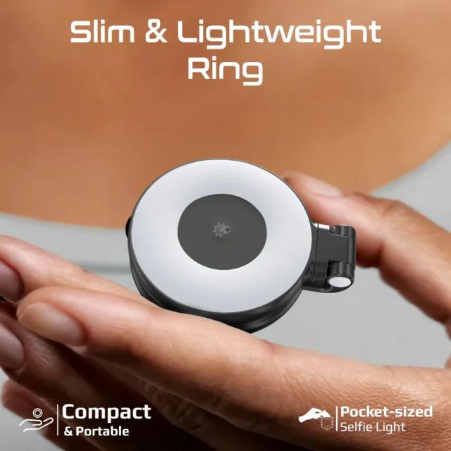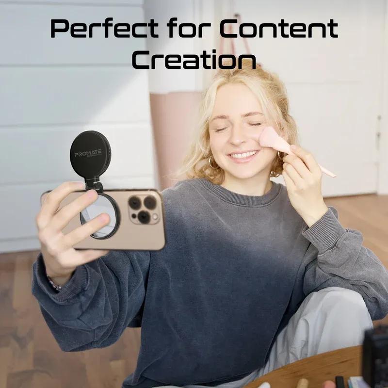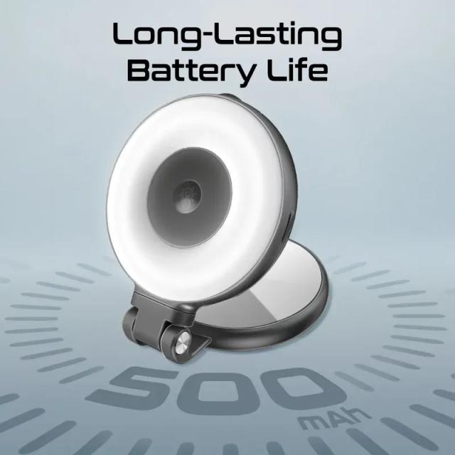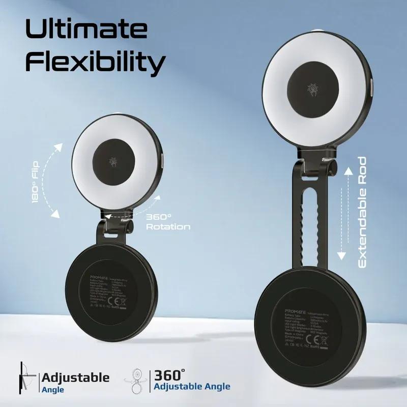Transform your photography and video creation with Promate's MagHalo-Pro, a sleek MagSafe-compatible selfie light that redefines portable lighting. Its ultra-slim and lightweight ring design features a brilliant 80lm LED brightness, delivering luminous lighting in a sleek and portable form and three versatile lighting modes—cold, soft, and warm—to suit every mood and setting. Fine-tune the light intensity with precision control while benefiting from 360° rotation and a 180° flip for unparalleled flexibility. The extendable rod ensures the perfect angle, while the powerful N52 magnet attachment keeps it securely in place on smartphones or magnetic selfie sticks. Powered by a high-capacity 500mAh Li-Polymer battery, the MagHalo-Pro delivers reliable performance on the go. Effortless charging is ensured with the included 32cm cable, making this the ultimate companion for flawless selfies, professional content creation, or everyday illumination.