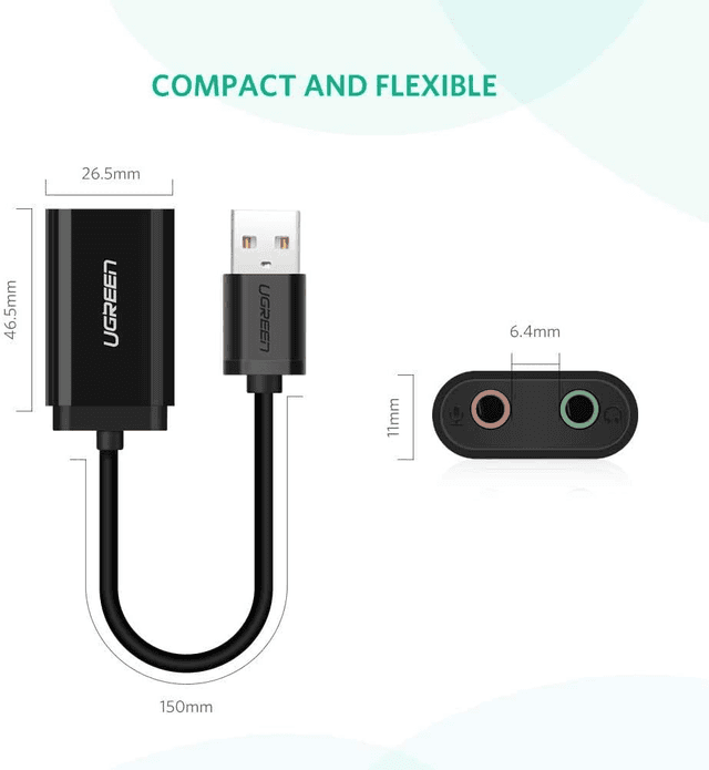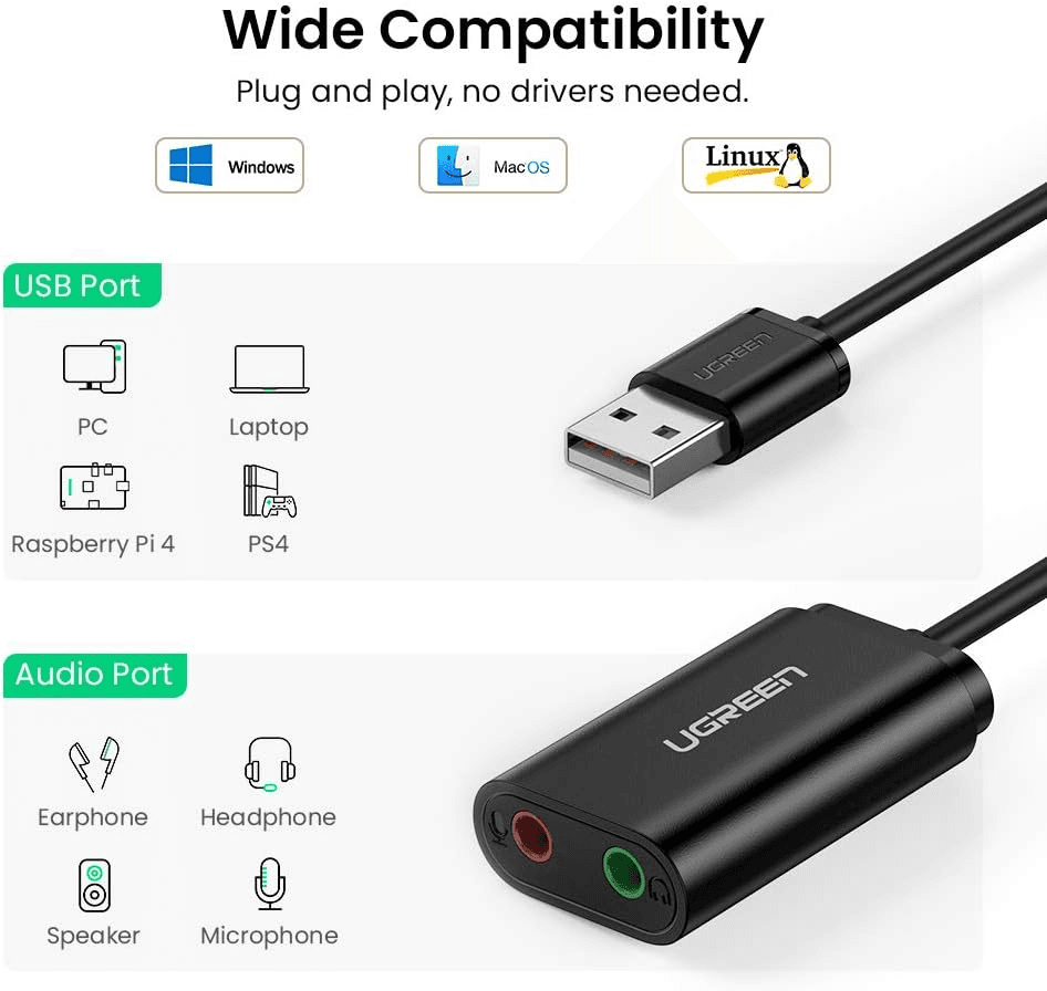 【Ideal Sound Card Option 】: UGREEN usb audio adapter is ideal to replace your faulty sound card or audio port, it adds a mono microphone-in and a stereo audio-out port to your computer through a USB port, which enables you to connect your existing headphones, headset, speakers, or microphone with 3.5mm jack to your PC through a USB interface.