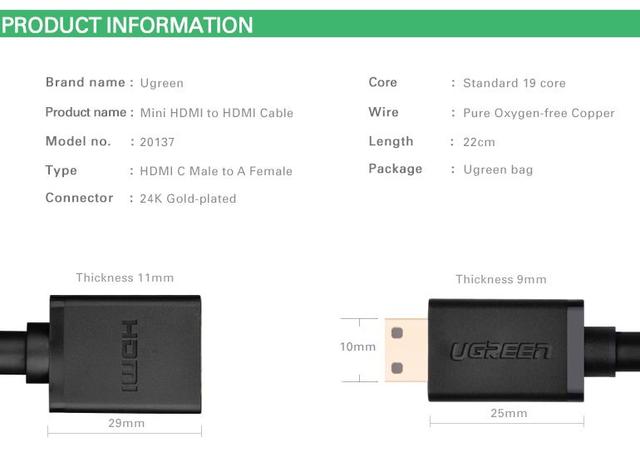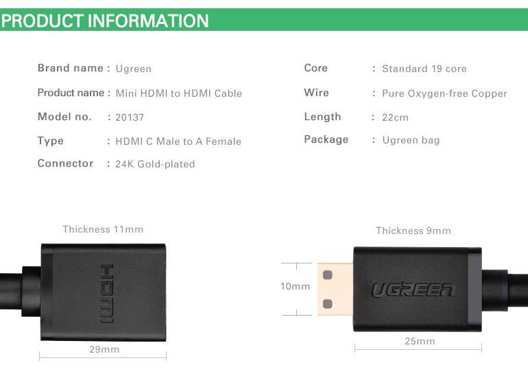 UGREEN Mini HDMI Male to HDMI Female Adapter Cable 22cm (Black)