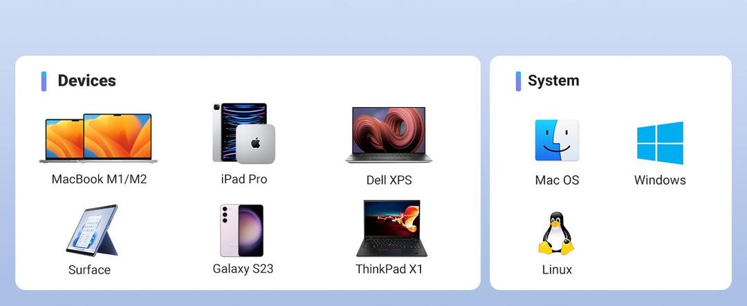 The product is compatible with many popular devices equipped with a USB-C port. With its help you can enhance the capabilities of your MacBook Pro, iPad Pro and even Samsung Galaxy smartphone, among others. The adapter works with operating systems such as Windows, Mac OS, Linux, as well as Android or iOS.