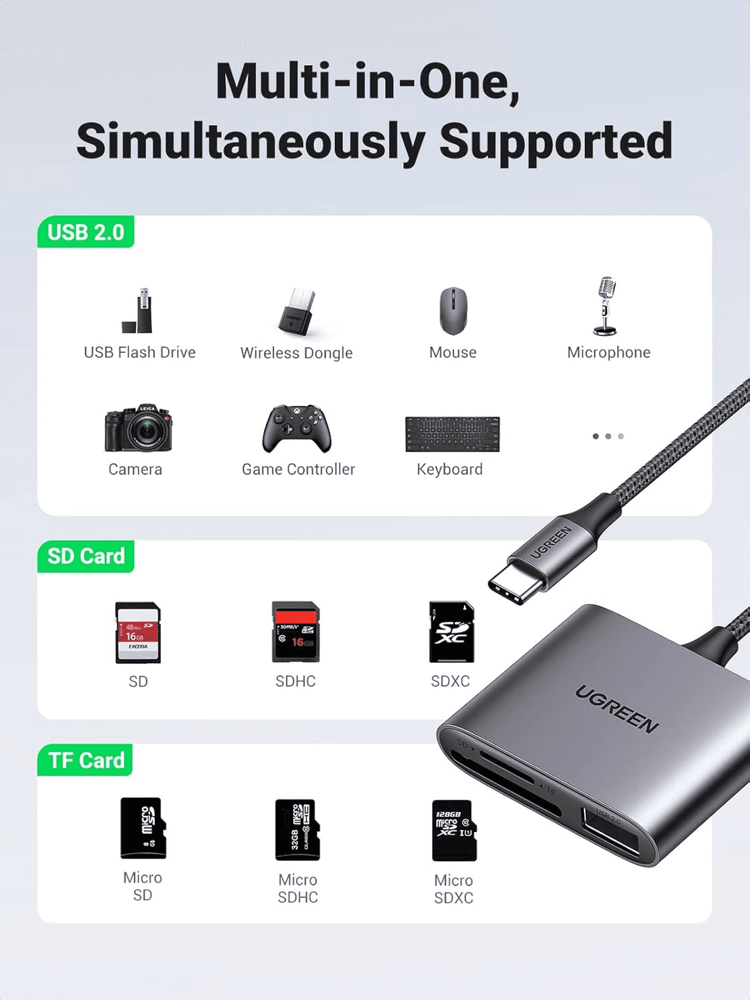 UGREEN SD Card Reader for iPhone 15 Pro Max USB C TF Memory Card Adapter With USB Port Compatible With SD/TF/Micro SD