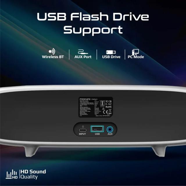 Introducing Promate’s Delta-X, a superior quality TWS speaker that delivers powerful stereo sound with a 20W speaker output. Designed with a futuristic, sleek spaceship aesthetic, it features 12 dynamic RGB lighting modes and two "landing lights" on the sides that respond to voice levels, creating a visually immersive experience. The Delta-X is equipped with dedicated dual bass and dual treble drivers, offering three EQ modes for a personalized audio experience. Its built-in omnidirectional hands-free microphone facilitates seamless hands-free communication, whether during video games or conference calls. The robust 6400mAh lithium-ion battery provides 20 hours of playtime with RGB lighting or 30 hours without, ensuring long-lasting enjoyment. With efficient power usage, a wireless operating range of up to 20 meters, support for USB flash drives up to 256GB, and a 20W USB-C input for fast charging, the Delta-X is the ultimate portable speaker for both audio and visual enjoyment. Audio that is out of this world! Combining style, performance, and versatility, the Delta-X is the pinnacle of innovation in portable audio.