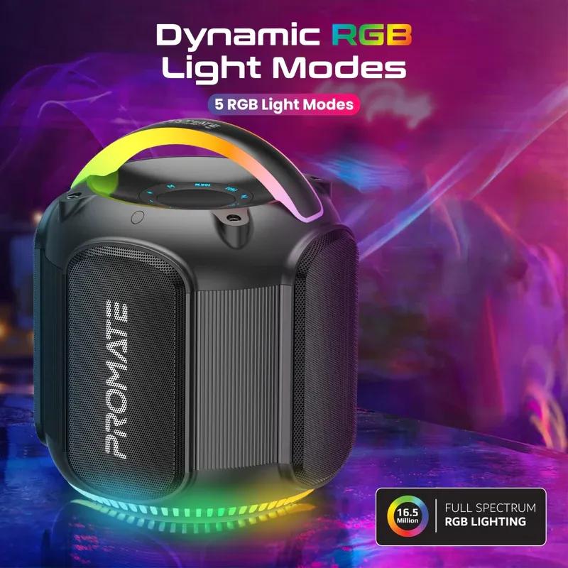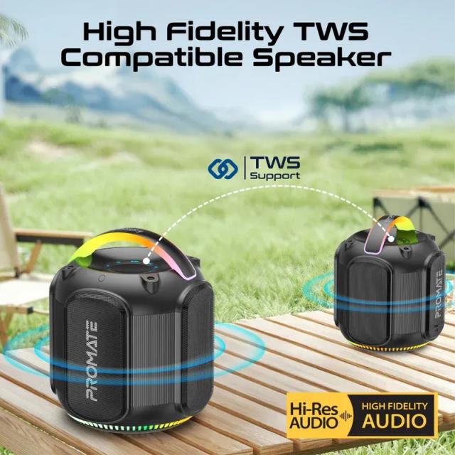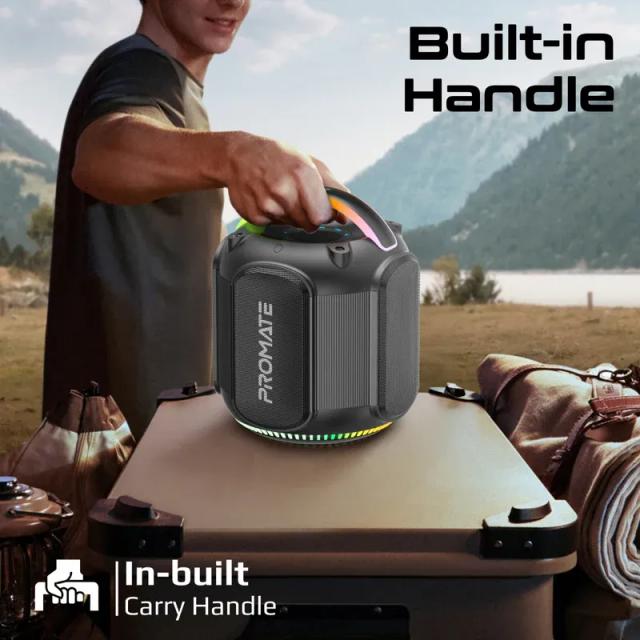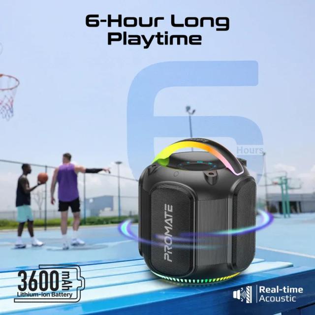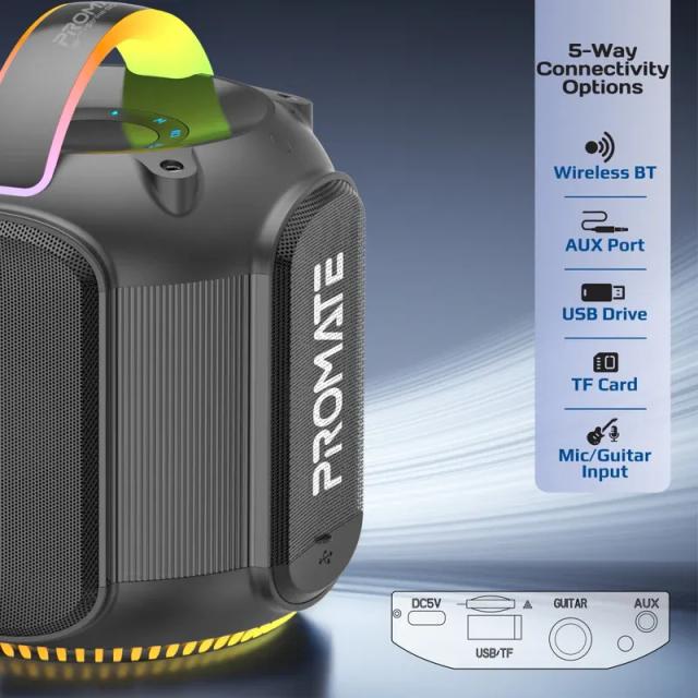 Strike-80 by Promate brings immersive sound and stunning visuals together in one dynamic speaker. Delivering 80W of stereo sound, this high-fidelity TWS-compatible speaker offers an exceptional listening experience. With 6 hours of playtime and a 3600mAh lithium-ion battery, it keeps the music going longer, while the 12 hours of standby time ensures it's always ready. Enjoy versatile connectivity with five audio playback options, including TF card, USB drive, AUX, and even a 1 / 4” guitar port for jamming along to your favourite tunes! The vibrant RGB lights set the mood with five dynamic modes, while the built-in handle with RGB lights adds a touch of style and portability. IPX5 water resistance makes it perfect for outdoor adventures, and quick music navigation keeps you in control. Strike-80 combines function, design, and performance in one powerhouse speaker.
