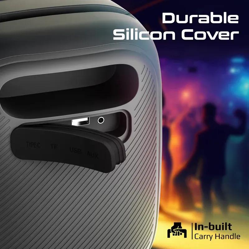 Experience sound that moves you with the Promate Strike-40, where bold design meets breathtaking performance. Feel every beat with 40W of high-fidelity audio, backed by a 6000mAh battery that keeps the music going for up to 6 hours. Transform any moment with 9 dazzling RGB light modes, all while your device stays secure in the built-in phone stand. Strike-40’s 4 different audio modes ensure instant access to your favorite tracks, and its silicone cover shields against splashes and spills. With IPX5 water resistance, this speaker isn’t just ready for the party—it’s ready for the adventure.