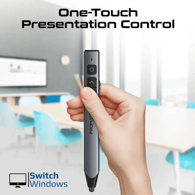 Promate’s ProPointer-S is the ultimate universal wireless presenter and multifunctional stylus pen, elevating your presentation experience and creativity. Ideal for business professionals and educators, this sophisticated device effortlessly combines laser pointing, wireless presenting, writing, and drawing, on both capacitive and infrared screens. Its intuitive design features one-touch presentation controls, a brilliant green laser pointer with a 200m reach, and a remarkable 50m wireless working range enabled by 2.4GHz RF technology. Enjoy stable connectivity, universal compatibility, and the ease of plug-and-play functionality. With a dedicated power switch and a built-in 220mAh lithium battery, the ProPointer-S guarantees long-lasting performance, making it the essential tool for captivating presentations and boundless productivity.