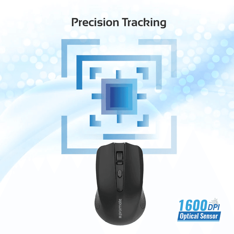 The Promate Clix-8 is a next-generation wireless optical mouse that works on any surface thanks to its use of an 800/1200/1600 DPI optical sensor. It is lightweight, portable, and extremely accurate. It comes with a bundled nano USB receiver that offers a plug-and-play functionality and gives it a working range of up to 10 meters. It's perfect for both home and office use.