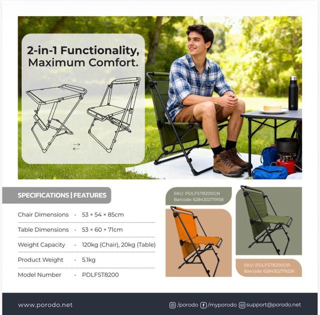 Porodo Lifestyle Dual-Function Foldable Camping Chair & Table