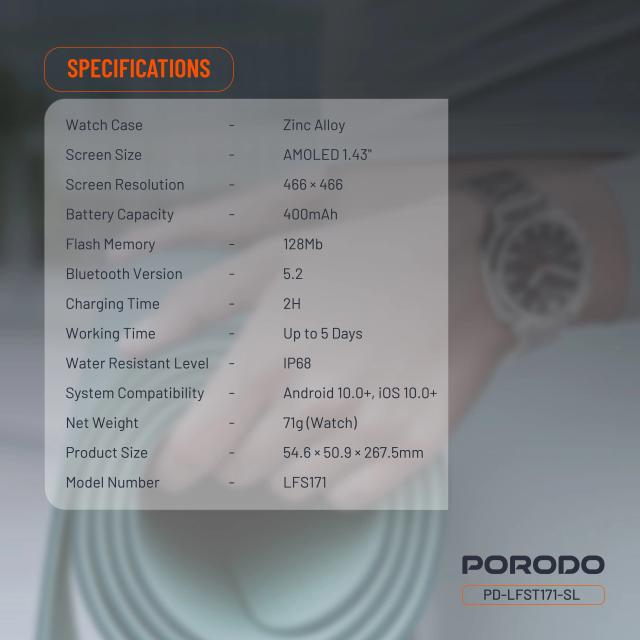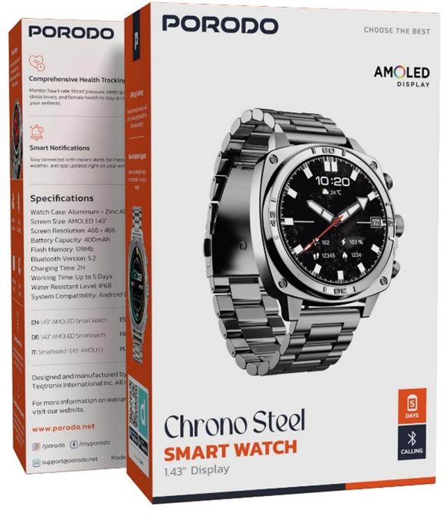 Featuring the premium 1.43" AMOLED display with 466 × 466 resolution, the Porodo Chrono Steel Smart Watch gives highly crisp visuals. The aluminum and zinc alloy case gives the watch that sturdy look. It features Bluetooth 5.2 for smooth connectivity and Bluetooth calls. While health remains an emphasis, it carries out all-round tracking such as heart rate monitoring and more. The 400mAh battery lasts up to 5 days. An IP68 rating for water resistance means it can withstand rugged usage. Personalize your watch with various watch faces and make good use of the fast charge that takes 2 hours. Compatible with Android 10.0+ and iOS 10.0+ devices, this watch has you connected and healthy, all while looking good.