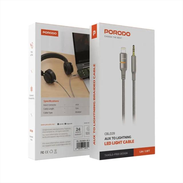 Porodo AUX to Lightning LED Light Cable - PD-CBL0029-GY-C