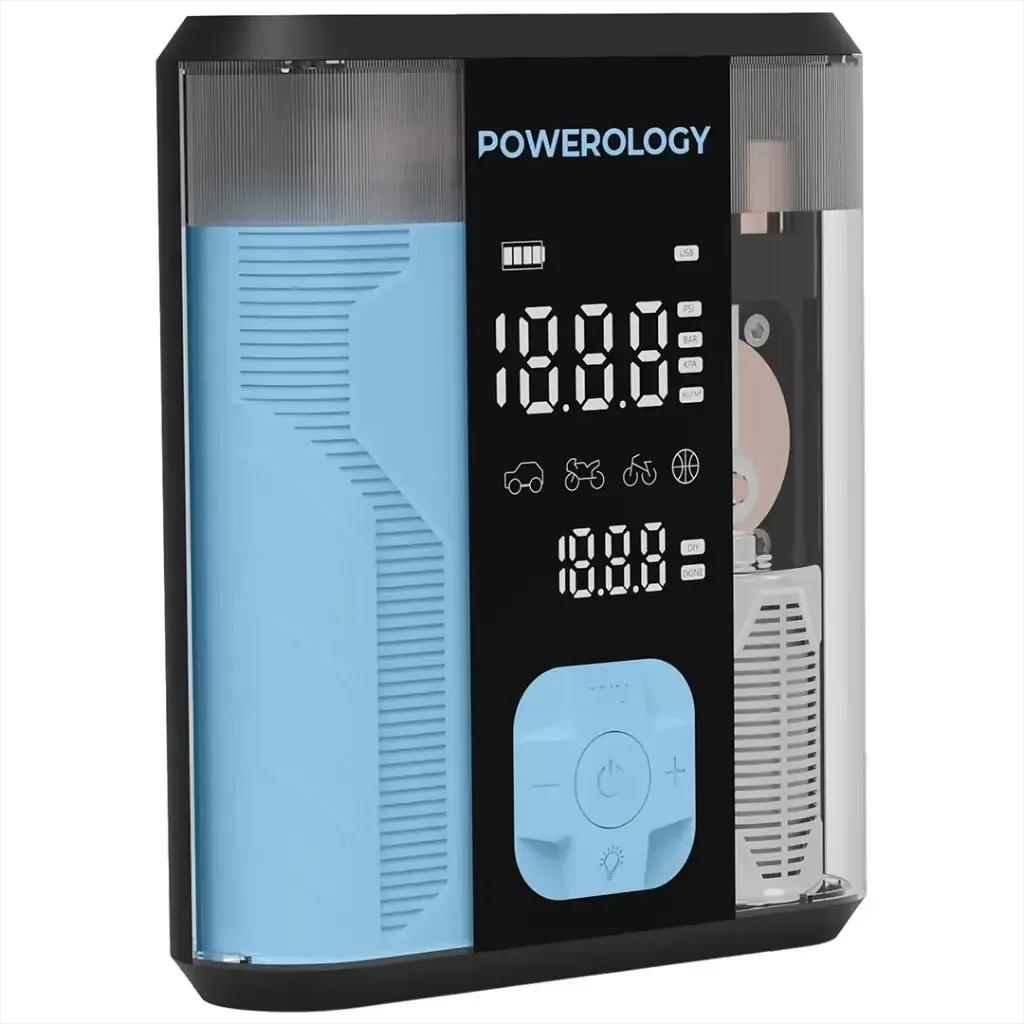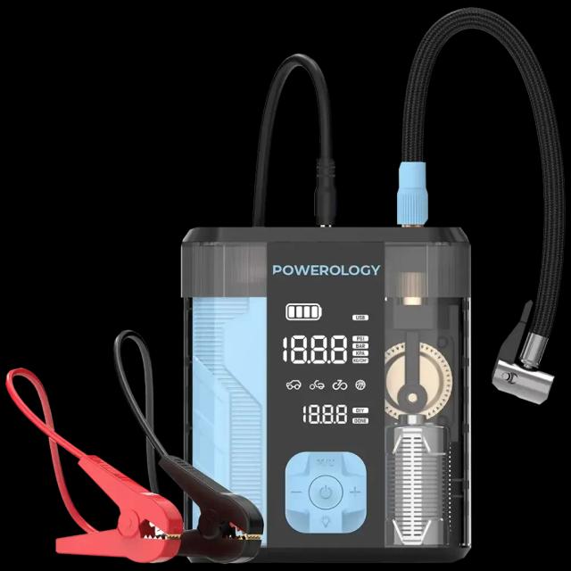 The Powerology 3-In-1 Jump Starter & Tire Inflator in protective black and blue hues is a powerhouse, a multi-functional device made for all your emergencies and automobile demands. It comes with a remarkable 12,000mAh battery in its system, and it gives a peak current of 1000A, which is enough to start your car very quickly. The built-in tire inflator can inflate to a maximum of 150PSI, plus the smart inflation system offers precision results of 0.01-bar accuracy. And with the PD 40W rapid charging and USB-A output, it powers your devices too. The inflator comes with an auto-stop feature to ensure that your tires are not over-inflated, and the digital pressure display makes it easy to monitor. This device continues to double as a power bank and also incorporates a flashlight for emergencies. The carrying case, which is very convenient to move about, along with the nozzles, air hose, and battery clips, is the accessory included with the device. The 3-in-1 utility tool is an excellent solution to having your car and devices powered, thus making sure that you are always prepared for anything.