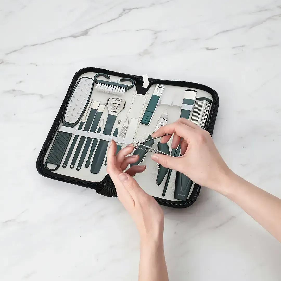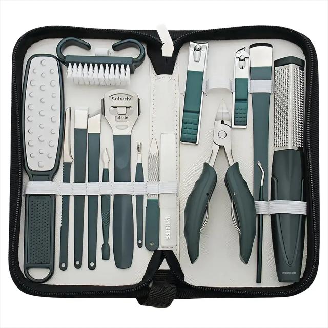The Porodo 16-in-1 Portable Nail Clipper Set for Manicure and Pedicure is a multifunctional and essential grooming set suitable for both manicure and pedicure services. It has 16 different instruments, including nail clippers, tweezers, cuticle pushers, etc., which are essential for a proper nail care regimen. The instruments are designed in such a way that they will not only facilitate proper and successful nail care but also enable the user to determine the speed of the grooming process. The tools are made of high-quality stainless steel that is strong and durable, thus they will last for years with reliable performance. The tiny and portable case lets you take this set with you wherever you go, whether at home, on vacation, or traveling. This set contains all the essential elements needed for complete nail care and, hence, is the best choice for anyone who desires a complete and user-friendly grooming solution. A portable all-in-one grooming set will always keep your nails looking perfect.