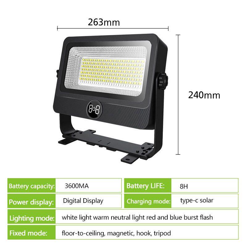 Powerful multi-color illumination suitable for work and emergencies.Solar and Type-C charging ensures continuous operation.Flexible mounting via hook, magnet, or stand.Digital display accurately shows the power level.Long battery life of up to 8 hours.Two USB ports for charging your phone and other devices.