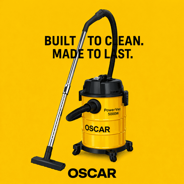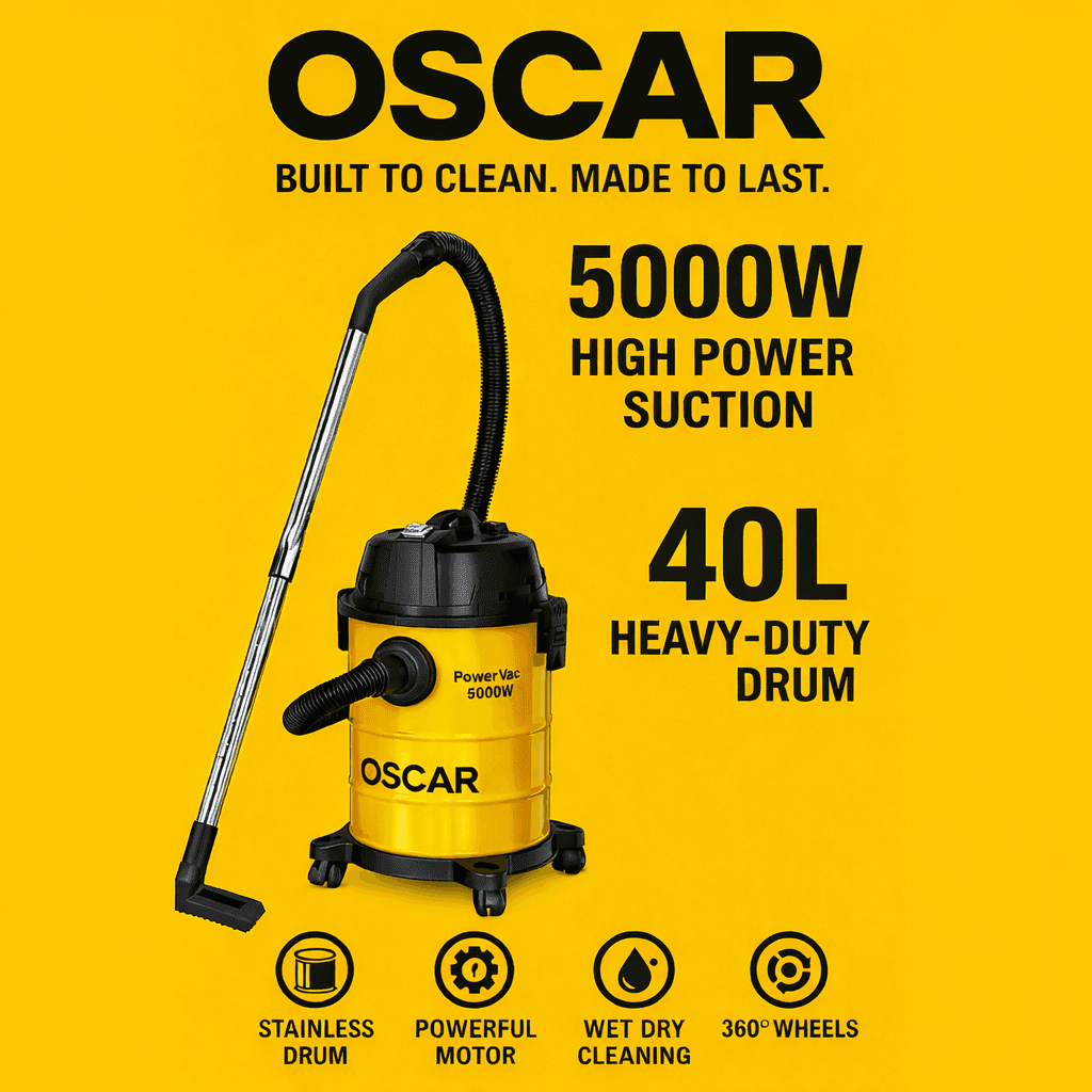 The OSCAR PowerVac 5000W Wet & Dry Vacuum Cleaner combines exceptional suction power with heavy-duty durability. Designed with a 40L liter stainless drum, it handles both dust & liquid spills efficiently. Its multifunctional system allows easy switching between vacuuming & blowing. The 360° swivel wheels ensure effortless maneuverability, while the lightweight design makes it portable. Perfect for households, workshops, and car interiors, the OSCAR PowerVac ensures long-lasting cleaning performance with reliability & ease.