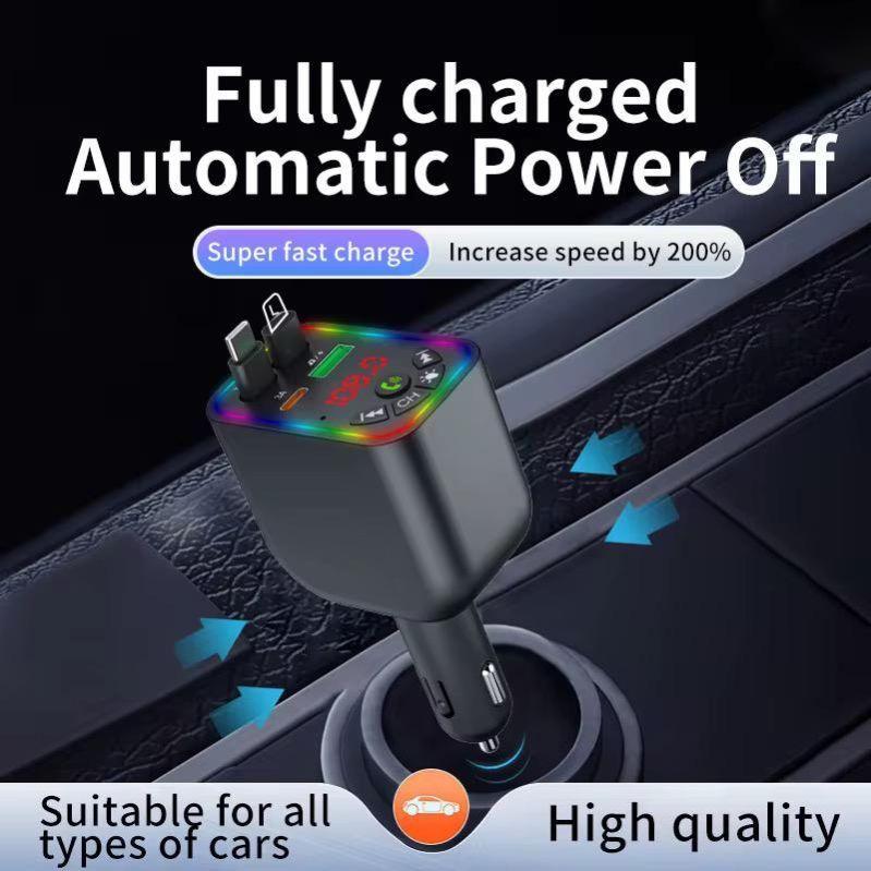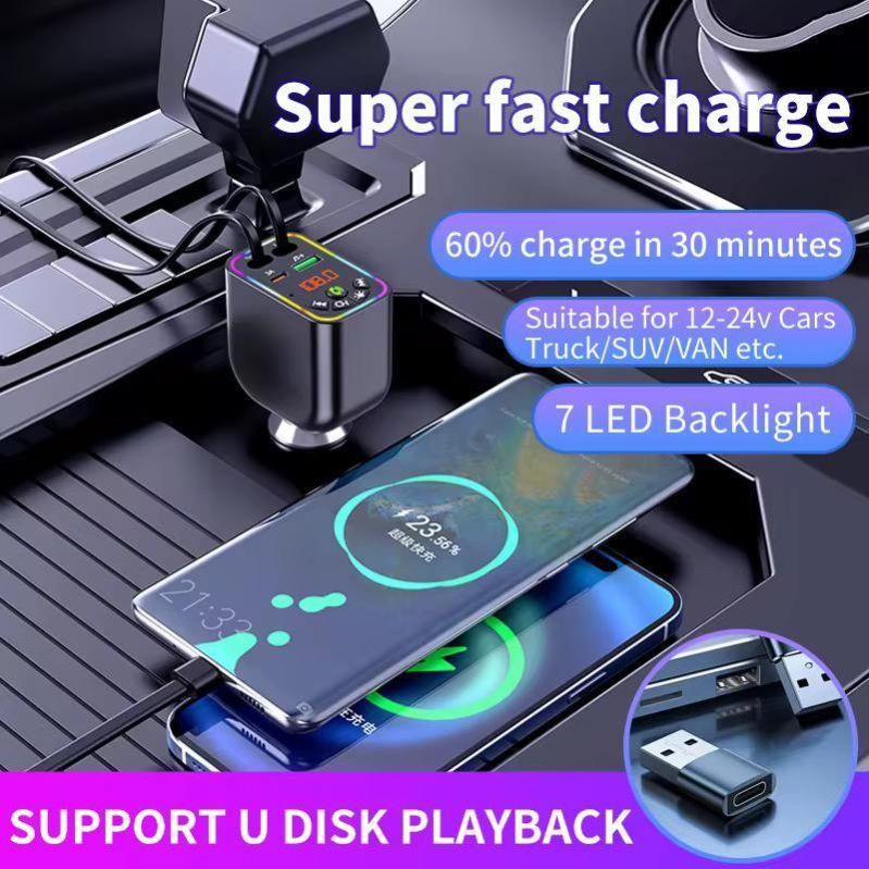Car-Y5 4-in-1 Car Charger with Bluetooth and FM Radio, 120W - Super Fast Charging with Retractable Cables