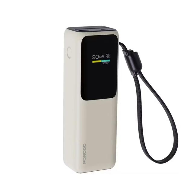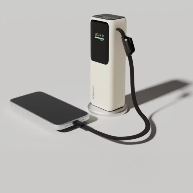 The power bank features a compact and practical design with a built-in Type-C cable, making it perfect for use while traveling or on the go.