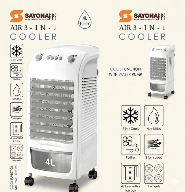 SAYONApps 4L 3-in-1 Air Cooler — Cooling, Humidifying & Air Purifying